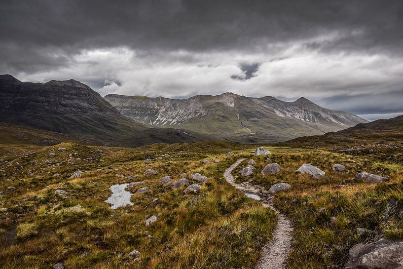 Des nuages sombres s'amoncellent au-dessus d'un sentier de randonnée dans les Highlands écossais, avec vue sur le massif montagneux de Beinn Eighe.