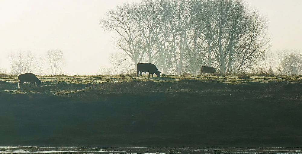 Op een vroege mistige ochtend zag ik deze grazende koeien in het vroege ochtendlicht staan. Het was een mooi beeld van rust.