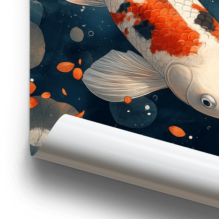 une œuvre d'art numérique représentant des poissons koï dans un étang, la couleur dominante des koï étant le blanc. avec de magnifiques accents d'art numérique