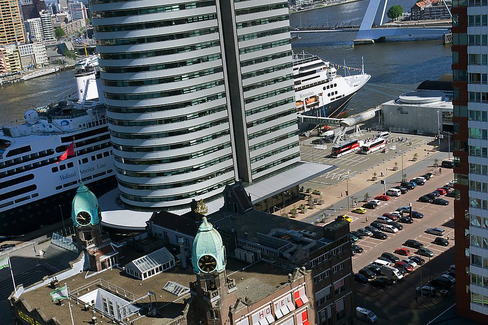 Luchtfoto van de skyline van Rotterdam gezien vanaf de Kop van Zuid met o.a. Hotel New York (oude terminal van de Holland Amerika Lijn) en het cruise schip De Rotterdam