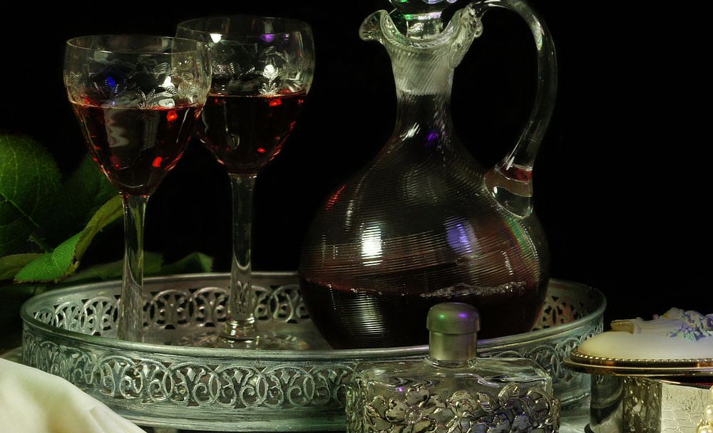 Het karafje en de geslepen wijnglazen zijn ca. 100 jaar! Het karafje is heel lang als azijnflesje in gebruik geweest. Door met licht te spelen en het bewerken van de foto heb ik wat diepte in de foto gekregen!