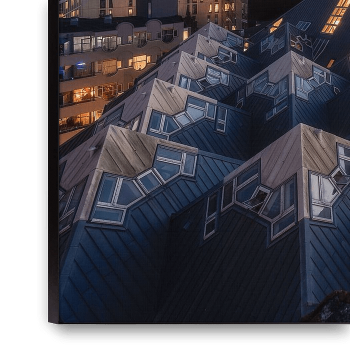 Achetez cette photo de Rotterdam Kubuswoningen at Night - Rotterdam Skyline par Niels Dam sur toile, aluminium, ArtFrame ou photographie (encadrée), impression d'art en haute qualité et tout format.