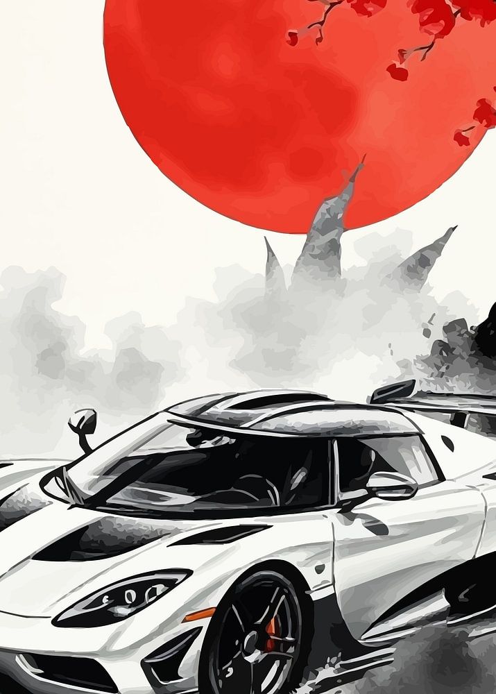La Koenigsegg Agera, représentée dans un élégant style sumi-e, file dans un paysage de rêve où l'encre noire coule à flots. Des fleurs de cerisier rouges tourbillonnent dans le vent, illuminées par une lune rougeoyante au-dessus de la tête. Une fusion saisissante entre la vitesse de pointe et l'art japonais intemporel.
