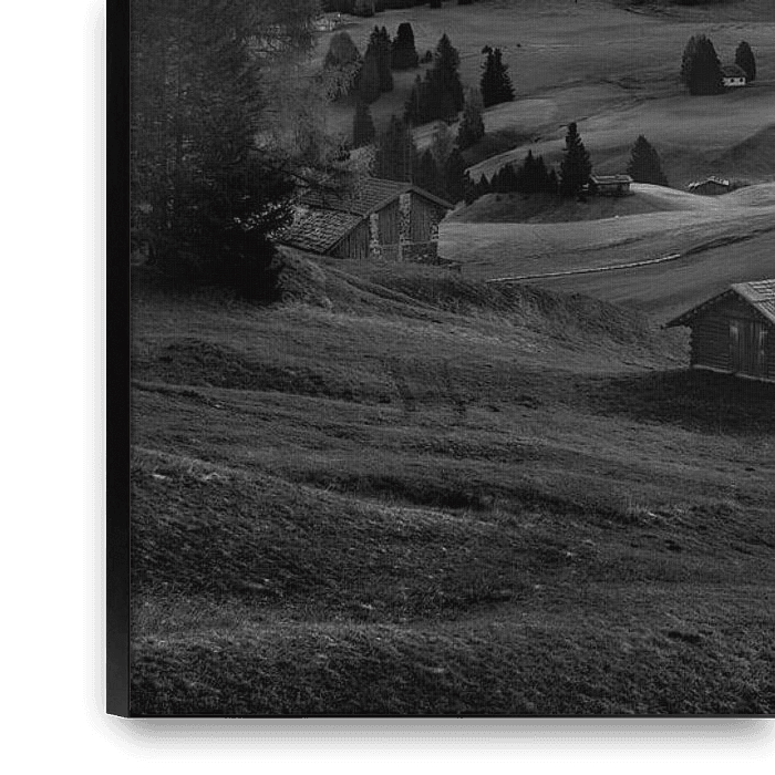 Achetez cette œuvre d'art de paysage L'Alpe de Siusi dans les Dolomites en noir et blanc . par Manfred Voss, Photographie Noir et Blanc sur toile, aluminium, ArtFrame ou photographie (encadrée), impression d'art en haute qualité et tout format.