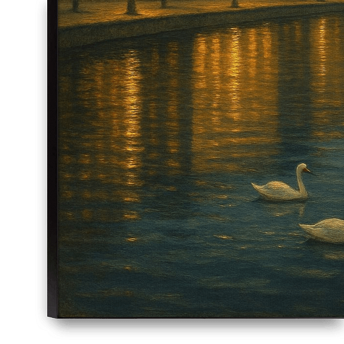 Cette peinture enchanteresse et sereine capture la magie tranquille du Binnenalster (lac intérieur de l'Alster) de Hambourg au crépuscule. La scène est dominée par le bleu profond et apaisant de l'eau et du ciel du soir, créant une toile de fond fraîche et atmosphérique pour les lumières chaudes et brillantes de la ville. Une rangée…