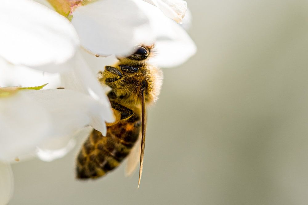Photo macro d'une abeille mellifère récoltant du pollen près d'une fleur blanche printanière.
