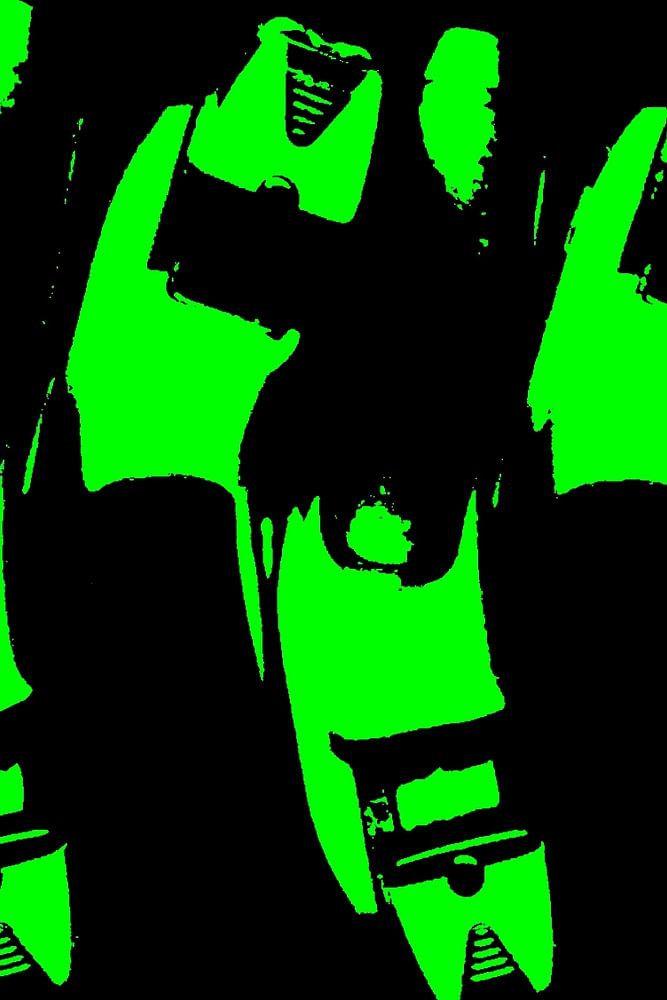 Image abstraite de quatre rasoirs en vert sur fond noir.