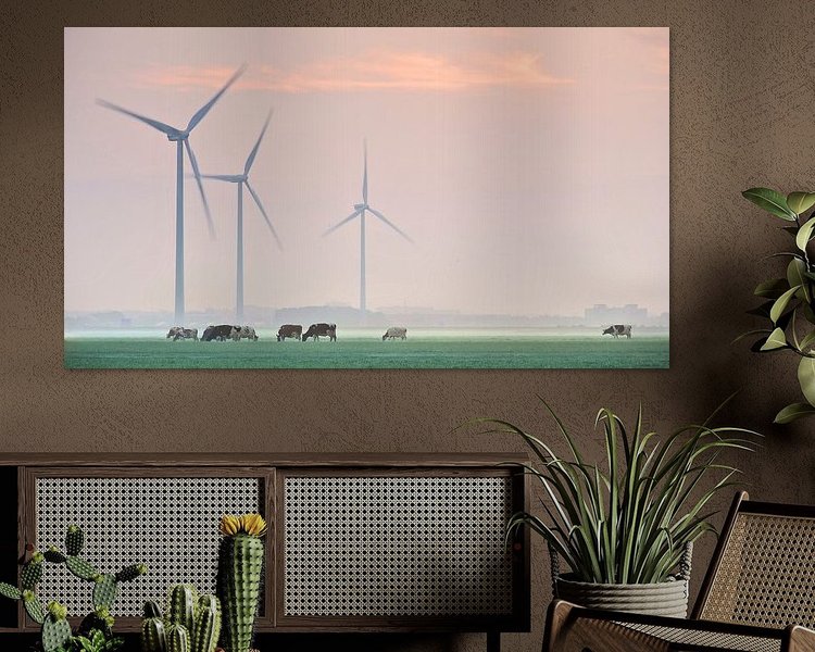 Une scène typiquement hollandaise, brouillard, prairies, vaches et moulins à vent. Mais avec une touche de modernité.