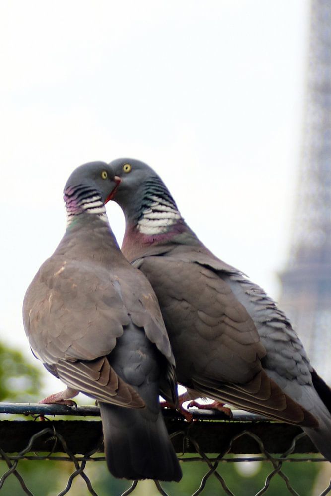 Een koppeltje verliefde duiven in het Tuilerieen park, genietend van het uitzicht op de Eiffeltoren