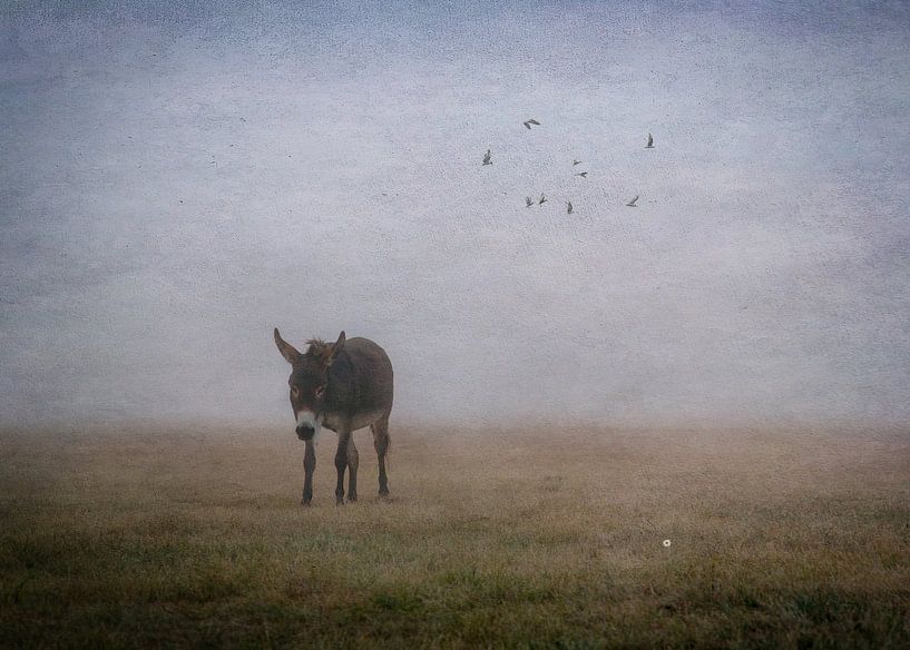 Achetez cette œuvre d'art d'oiseau L'âne dans le brouillard par Iris van Heusden sur toile, aluminium, ArtFrame ou photographie (encadrée), impression d'art en haute qualité et tout format.
