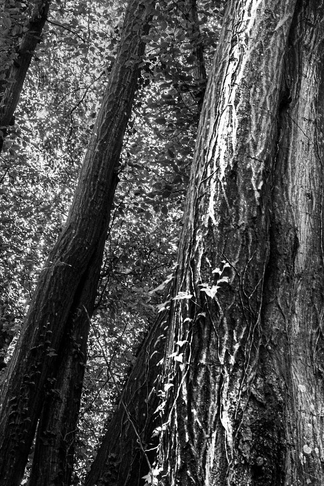 Une photo en noir et blanc d'un arbre recouvert de lierre