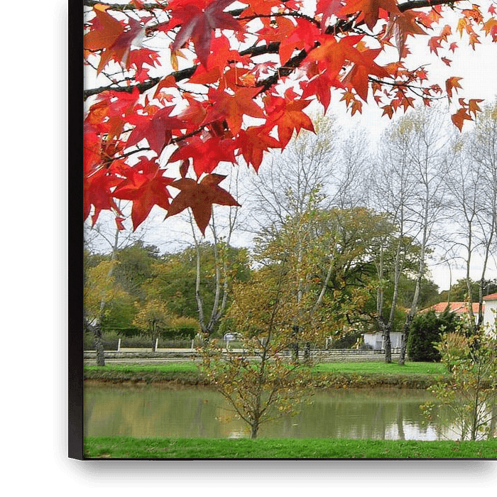 Une image d'un arbre d'ambre de couleur rouge. Le feuillage rouge couvre la moitié supérieure de l'image et surplombe un paysage d'arbres et un étang encore vert. Le rouge vif forme un beau contraste avec le vert. Une sculpture d'automne atmosphérique.