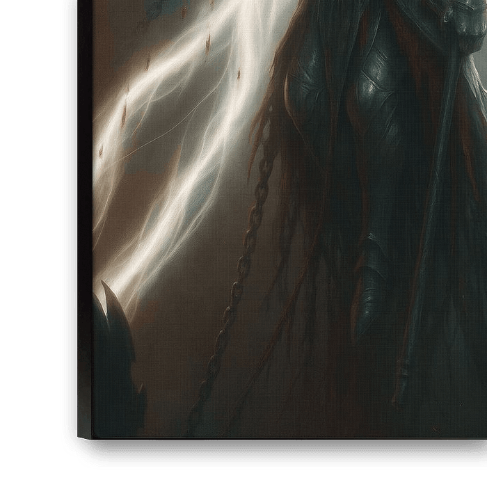 Un ange guerrier sombre et encapuchonné se tient au milieu d'une énergie divine tourbillonnante, son armure noircie brillant d'une lumière éthérée. Des courants de puissance rayonnante forment des ailes derrière lui, tandis que des chaînes tachées de sang pendent de ses mains, symbolisant à la fois la divinité et la damnation. Cette œuvre d'art mêle des éléments de fantaisie et d'obscurité, capturant la dualité d'un être céleste consumé par l'ombre tout en brandissant la lumière divine.