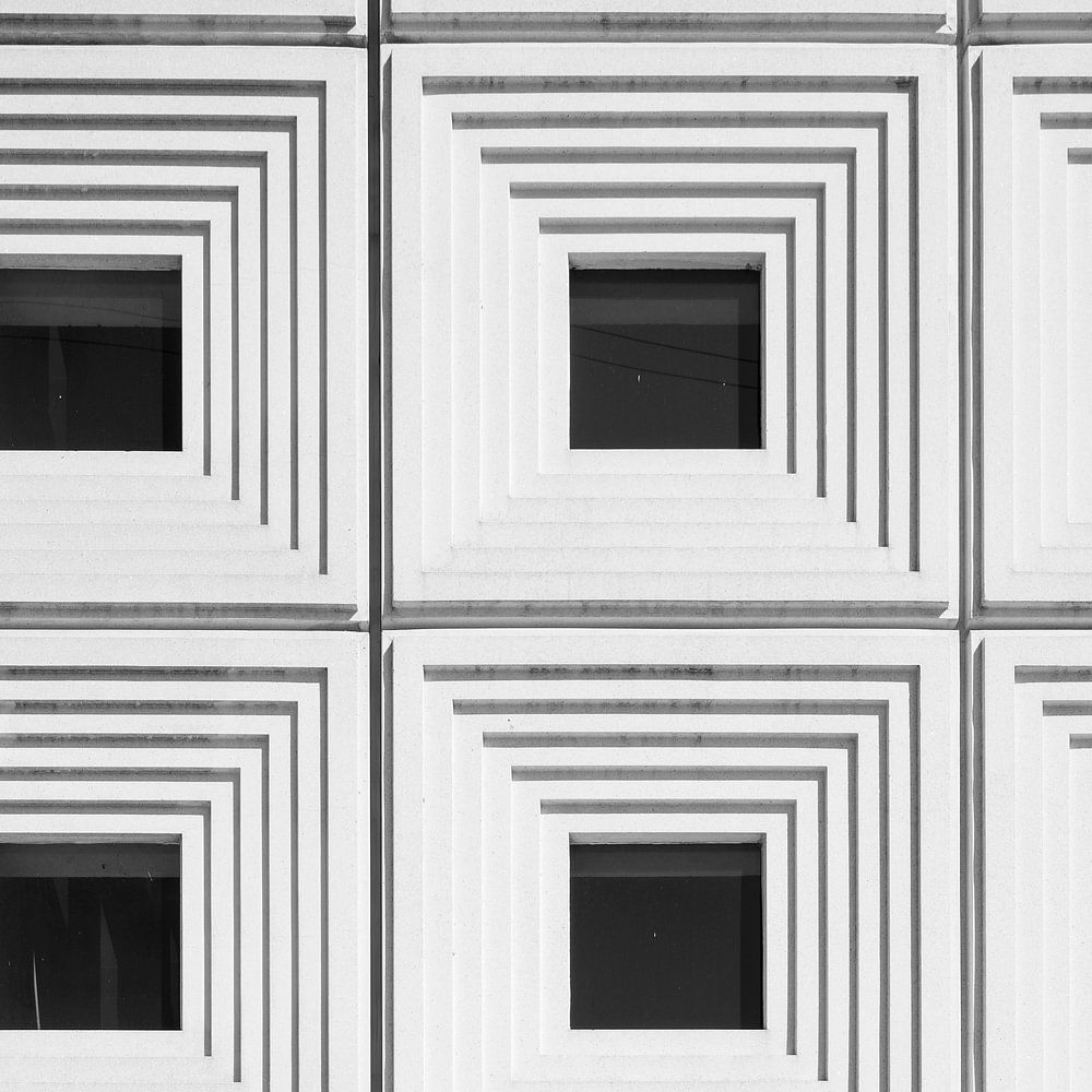 Le projet consiste en un bâtiment d'accueil, comprenant un auditorium et un crématorium (bâtiment à four) sur le cimetière existant. Les façades et les murs intérieurs du bâtiment du crématorium sont construits à partir d'éléments en béton préfabriqué blanc, porteurs et stabilisateurs, qui sont visibles à l'extérieur comme à l'intérieur comme du béton apparent, dit « architectural ». Le bâtiment semble être construit à partir de blocs solides mesurant 1 x 1 x 1 mètre. En tant que travail indépendant, j'ai réalisé une série de photos de ce bâtiment. La photo que je présente ici est un détail de la façade extérieure. J'adore le look graphique et minimaliste de cette image.