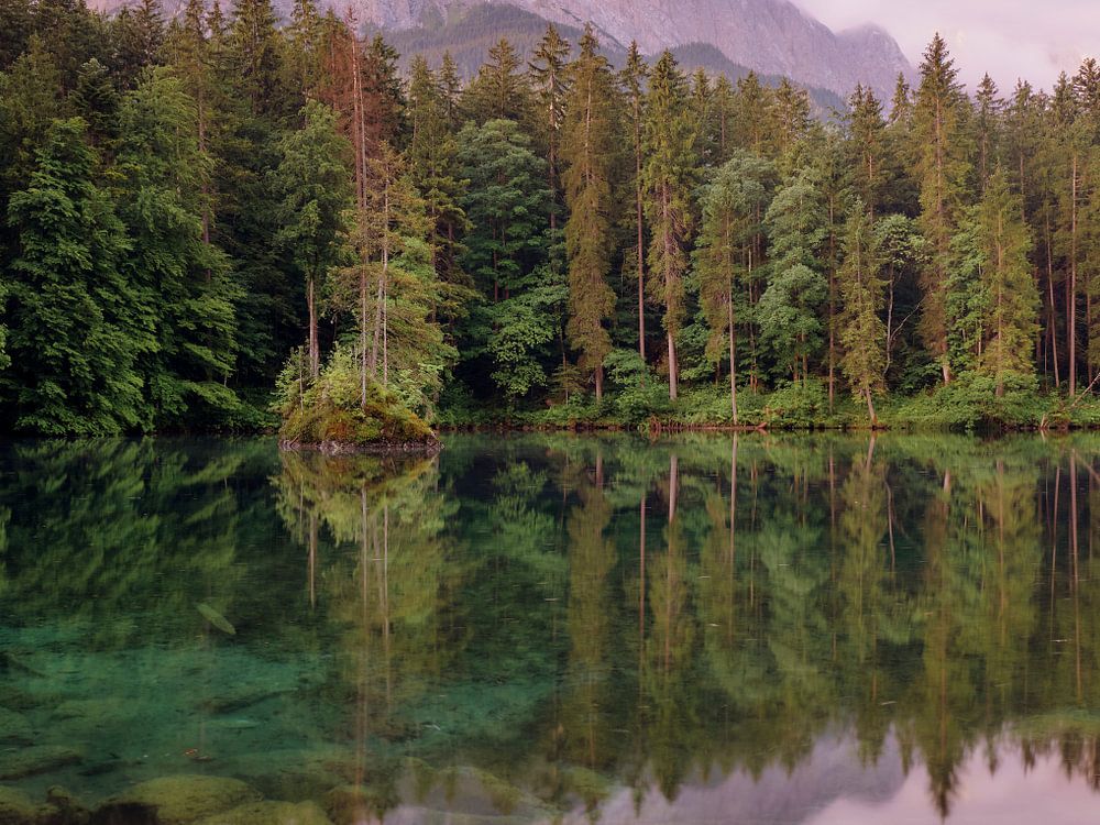 L'aube au Badersee à Grainau, avec en arrière-plan la Zugspitze.