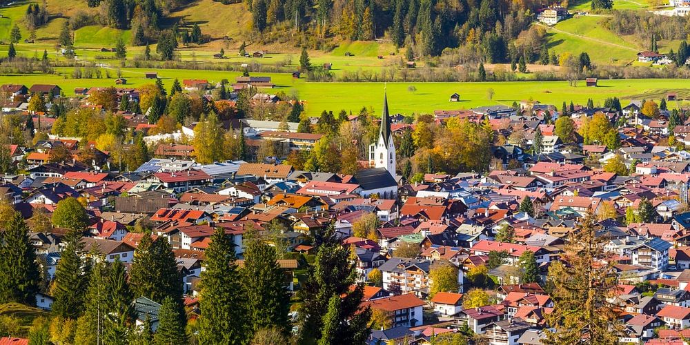 Au loin, les toits d'Oberstdorf scintillent comme de petits bijoux dans la chaude lumière du soleil. Le clocher de l'église se dresse fièrement, tandis que la rivière serpente doucement à travers le paysage. C'est un spectacle qui capture le caractère éphémère de la vie et la beauté de l'instant.