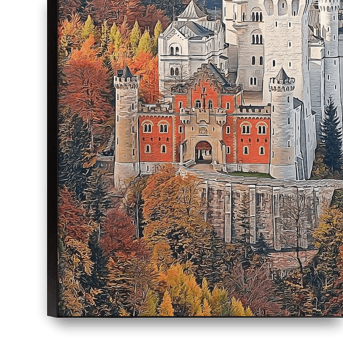 Une adaptation numérique à l'huile du château de Neuschwanstein, un palais néo-roman du XIXe siècle situé sur une colline accidentée au-dessus du village de Hohenschwangau près de Füssen dans le sud-ouest de la Bavière, en Allemagne.