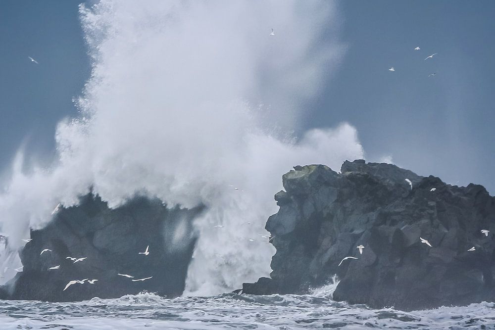 L'eau de mer agitée a atterri sur ce rocher avec fracas. Un éclat de splendeur et des oiseaux de mer qui planent devant.