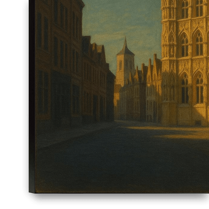 La lueur dorée de Louvain représente l'hôtel de ville gothique orné de la ville, illuminé par les derniers rayons du soleil. Ses tours complexes brillent comme une dentelle d'or en fusion, tandis que la rue environnante repose dans une ombre sereine. L'artiste s'inspire de la maîtrise de l'immobilité d'Edward Hopper, capturant non pas…