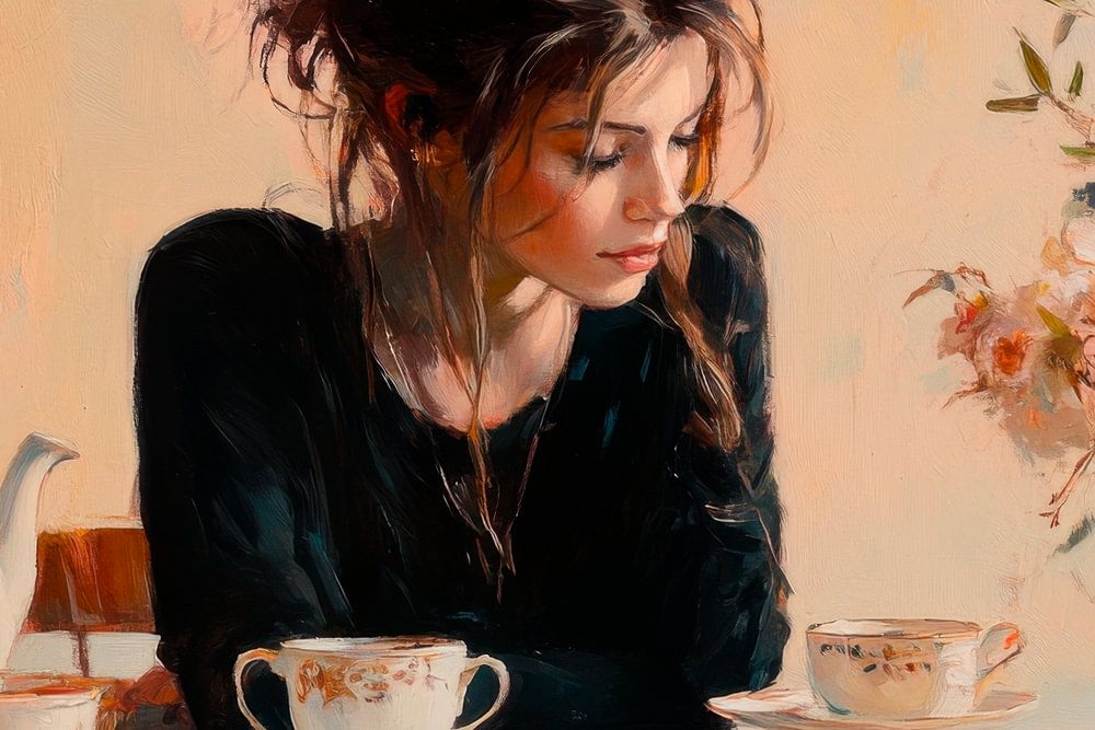 Dans des tons doux de terre et de pastel, une femme pensive s'enfonce dans une heure de thé silencieuse. Son chignon ébouriffé contraste vivement avec l'élégante nappe et les fines tasses en porcelaine. Des fleurs éclatantes dans un vase semblent capter la lumière et confèrent à la scène une touche de vivacité, tandis que l'atmosphère paisible incite à la rêverie.