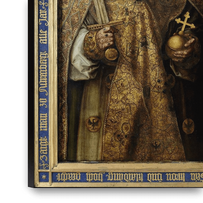 L'empereur Charlemagne, Albrecht Dürer (1511) Avec ce portrait monumental, Albrecht Dürer a créé une image idéale du grand empereur Charlemagne. Comme l'indique l'inscription au-dessus du tableau, l'image de l'empereur créée par le maître de Nuremberg n'a pas été copiée, mais est née entièrement de son imagination. Le panneau, ainsi qu'un portrait de l'empereur Sigismond de la même taille, servaient de portes à une armoire qui contenait les vêtements de couronnement et les insignes impériaux dans la nuit précédant la cérémonie publique annuelle sur la principale place du marché de Nuremberg. Flanquant la relique, les peintures du plus célèbre artiste de Nuremberg, Albrecht Duerer, renforçaient la revendication de la ville à l'égard des insignes impériaux.