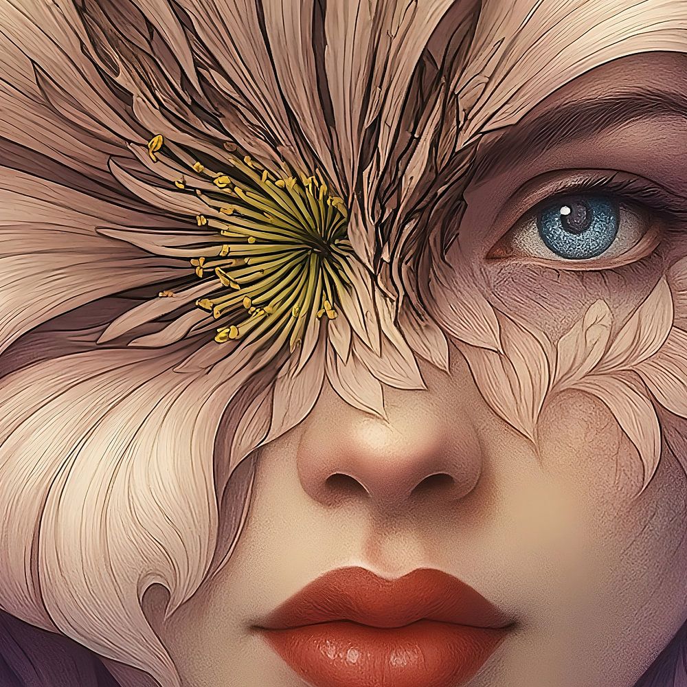 Bloom of Inner Light montre une figure féminine dont le visage se fond partiellement dans une gracieuse fleur. Les pétales de la fleur coulent dans ses cheveux et sur sa peau comme de douces vagues, faisant littéralement de la nature une partie de son identité. Les couleurs sont douces et harmonieuses et correspondent parfaitement à l'atmosphère de calme et de croissance. Un œil est caché derrière la fleur, tandis que l'autre, d'un bleu vif et perçant, semble regarder droit dans l'âme du spectateur. La combinaison de l'homme et de la nature dégage de la douceur, du mystère et de la force. L'œuvre a un aspect éthéré, comme si la figure se trouvait entre le rêve et la réalité.