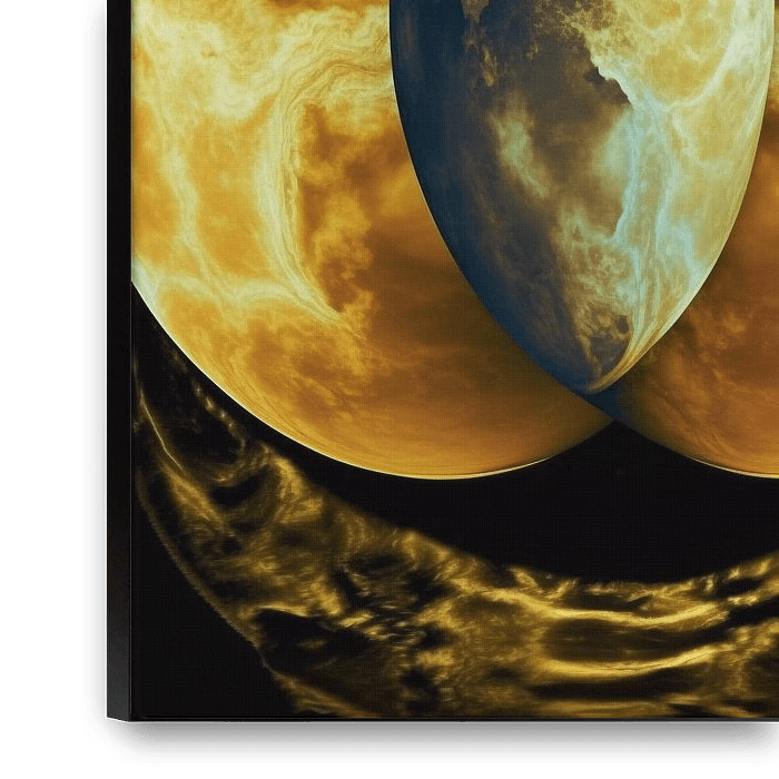 L'équilibre céleste présente un design symétrique captivant avec deux moitiés de planète dorées et rayonnantes, enveloppées de nuages tourbillonnants. Ces formes lumineuses sont reliées par une sphère centrale plus sombre, décorée de motifs fluides et entrelacés. L'interaction de la lumière et de l'ombre ainsi que le mélange harmonieux…