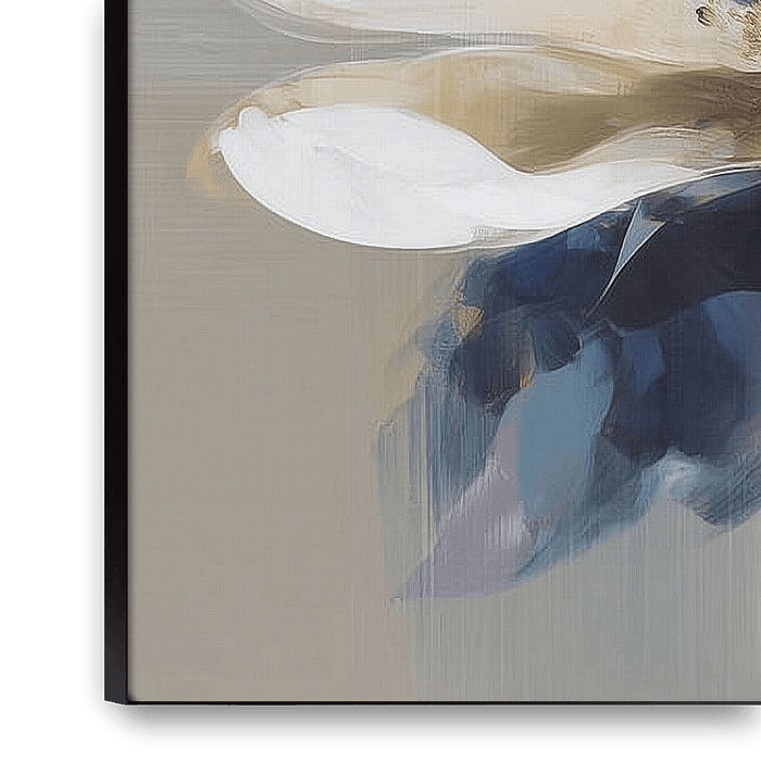 Gracieuse fleur en pleine éclosion, rendue dans un équilibre élégant entre abstraction et réalisme. Les pétales, larges et fluides, sont peints dans une palette de blanc, de crème et de tons de terre subtils, avec des accents profonds de bleu, de violet et de bleu nuit dans le bas. Ces pétales sombres créent un contraste puissant avec…