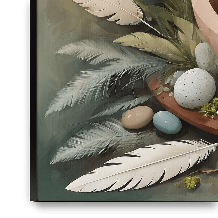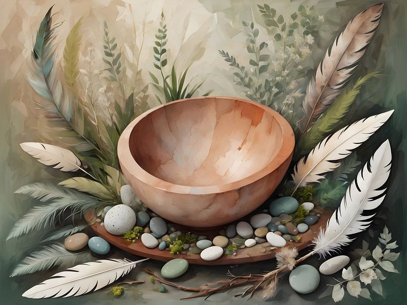 Cette composition réunit une combinaison harmonieuse d'éléments naturels. Au centre se trouve un bol en bois lisse, entouré de plumes, de pierres et de mousse soigneusement placées. Les couleurs sont douces et apaisantes, allant des tons de terre aux verts et bleus subtils. Le choix des plumes et des matériaux naturels évoque un…