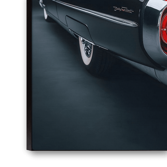 La voiture apparaît comme un symbole de l'ère de l'optimisme américain - une foi en l'avenir coulée dans le métal. L'atmosphère sombre et réduite du studio place la forme dans une lumière presque muséale. Dans l'ensemble, l'image est fière, intemporelle et élégante, avec une touche de rétro-futurisme.