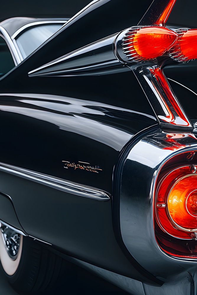 L'image montre l'arrière impressionnant d'un coupé Cadillac Series 62 - reconnaissable entre mille avec ses grands ailerons arrière futuristes et ses doubles feux arrière en forme de fusée. Le noir brillant de la peinture, le chrome généreux et les lignes élégantes créent une silhouette emblématique de l'ère automobile de la fin des années 1950 au début des années 1960. La perspective met en valeur l'aileron qui semble s'élancer vers le ciel comme une fusée spatiale.