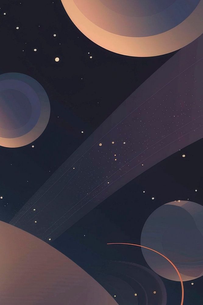 L'image montre une scène spatiale fascinante avec plusieurs planètes aux teintes douces. On remarque les grands corps célestes ronds entourés de fins anneaux, ainsi que le noir profond de l'arrière-plan, qui renforce l'impression d'immensité et de profondeur mystérieuse. Des étoiles scintillent discrètement en arrière-plan et confèrent à la composition un caractère onirique.