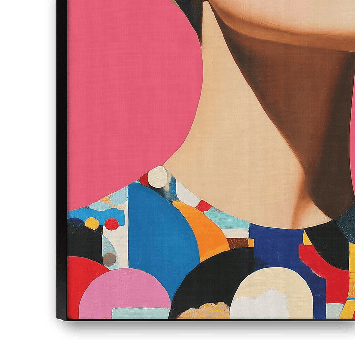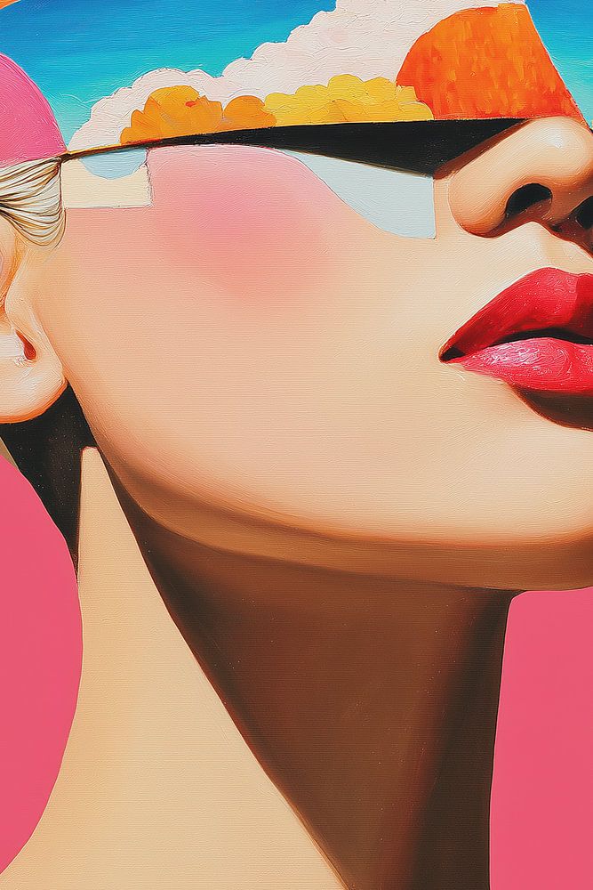 Portrait surréaliste d'une femme portant une tenue colorée et un bandeau sur lequel on aperçoit un paysage pittoresque. Une fusion de la mode et de la fantaisie.