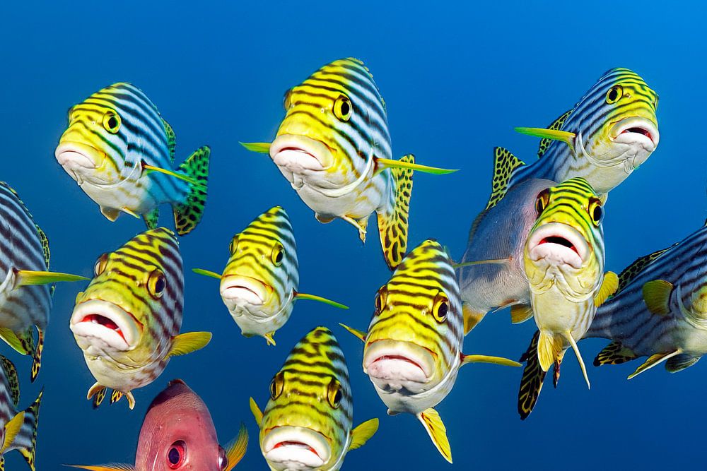 Mélange de poissons, essaim d'algues orientales (Plectorhinchus orientalis) et de vivaneau de cuivre (Lutjanus bohar), océan Indien, Maldives