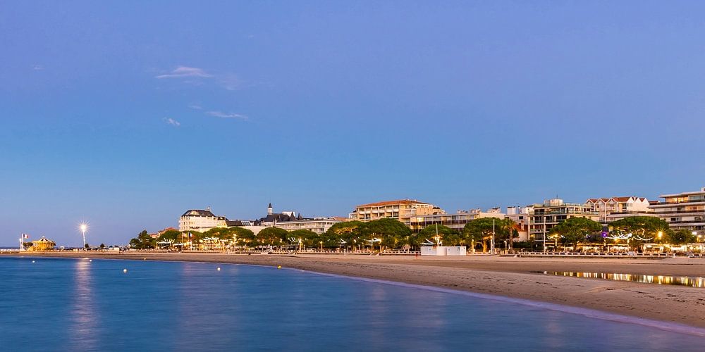 Heure bleue à Arcachon avec plage et front de mer dans le Bassin d'Arcachon, Aquitaine, Nouvelle-Aquitaine, France.