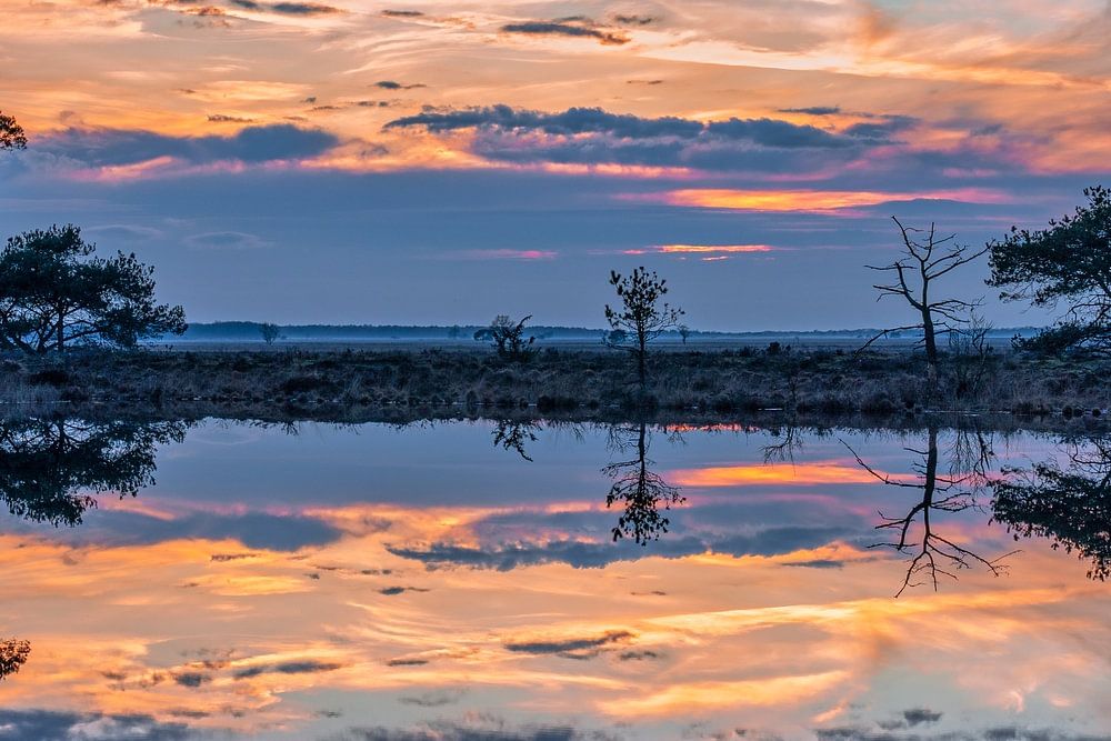 J'ai pédalé jusqu'au parc national de Dwingelderveld par une belle journée froide mais sans vent, pour prendre des photos. Le moment était bien choisi, c'était très calme et serein. Le soleil se couchait lentement. Il n'y avait pas de vent, ce qui donnait des couleurs et des reflets magnifiques dans l'eau.
