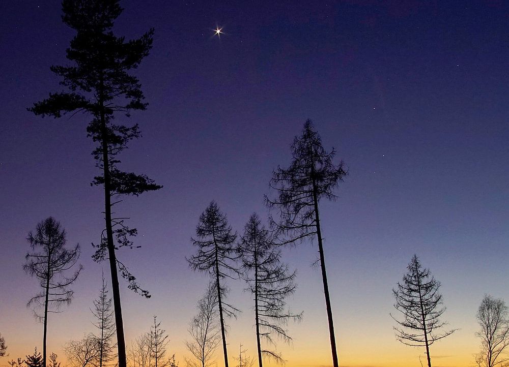 Lorsque l'heure bleue est presque terminée, les premières étoiles apparaissent dans le ciel.
