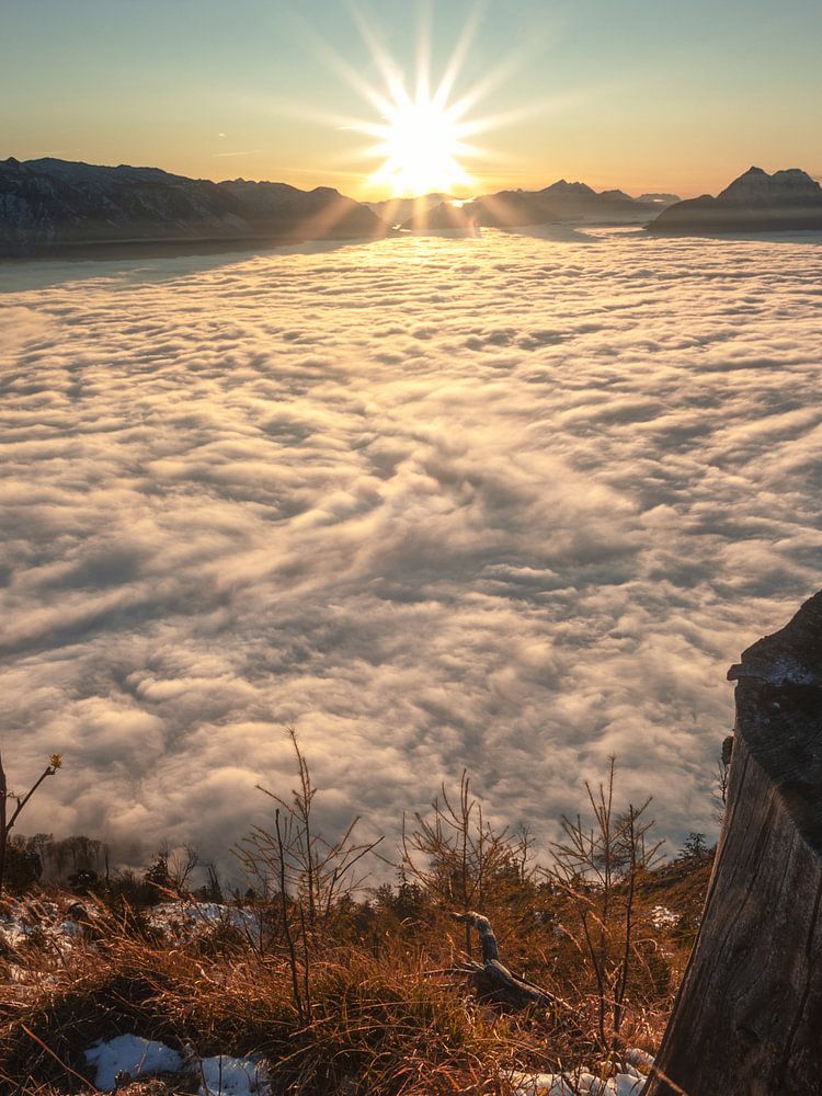 Coucher de soleil du Gaisberg. Salzbourg se trouve sous une épaisse couverture de brouillard.
