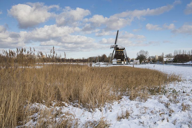Cette photo montre un moulin hollandais dans un paysage enneigé. La neige est désormais rare aux Pays-Bas, mais l'année 2026 a commencé avec une bonne couche de neige. Le ciel nuageux typiquement hollandais complète la photo.