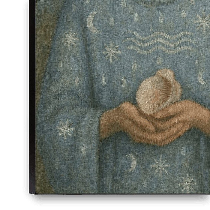 Silencieux comme la neige et clair comme le clair de lune, l'hiver se tient debout. Ses yeux écoutent, sa présence est un souffle dans l'obscurité. Dans ses mains, un coquillage - symbole du silence, de la mémoire et du son intérieur. Elle vous invite à vous reposer, à rêver et à vous rappeler qui vous êtes sous la surface.