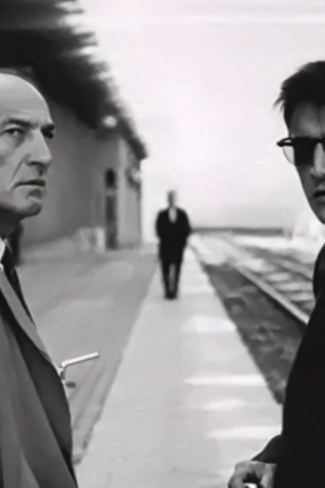Une photo en noir et blanc montre deux hommes sur un quai de gare vide. Tous deux portent des manteaux classiques - l'un avec un regard sévère et méfiant, l'autre avec des lunettes de soleil et une élégance froide. En arrière-plan, une silhouette solitaire attend dans la profondeur de la perspective, tandis que le toit et ses lignes rythmées plongent la scène dans une tension graphique. La lumière est dure, les ombres nettes - tout semble contrôlé, mystérieux et plein de sens inexprimés.