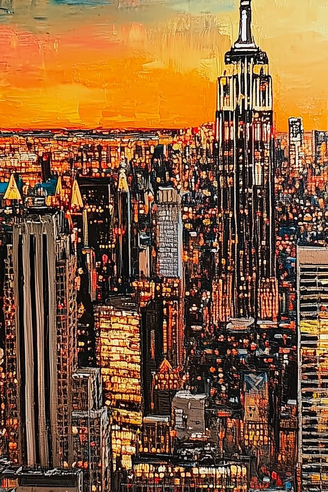 La composition capture l'essence de New York : une ville à l'énergie et à la croissance incessantes, mais aussi au calme et à l'harmonie dans l'espace entre les gratte-ciel. Le tableau vous invite à découvrir la puissance et la beauté de la ville sous toutes ses facettes, de ses icônes aux détails cachés qui la rendent unique.