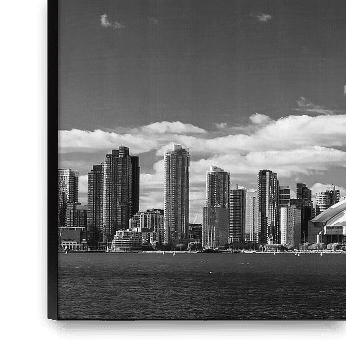 Depuis les îles de Toronto en noir et blanc, la vue sur la ville et l'horizon de Toronto avec la Tour CN et le Centre Rogers est vraiment à ne pas manquer....