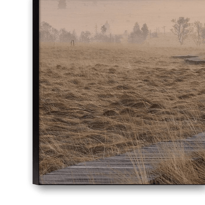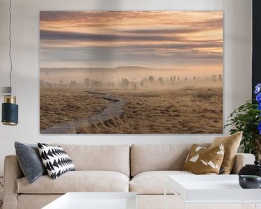 Cette photo a été prise un matin typique dans les Hautes Fagnes en automne. Le ciel nuageux s'était paré des couleurs délicates du lever du soleil. Au loin, une légère brume se trouvait au sol, ce qui renforçait encore l'atmosphère mystique. La petite passerelle en bois traverse l'image de manière pittoresque et guide le spectateur à travers le doux paysage. Parfait pour tous ceux qui apprécient le calme et la beauté de la nature.