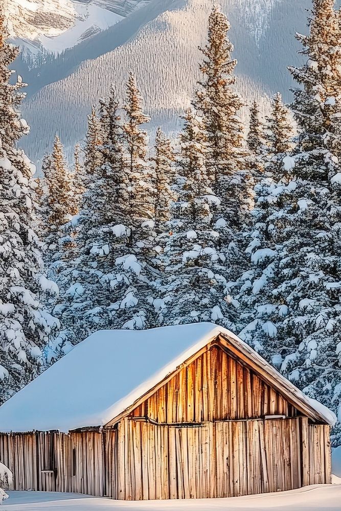 Niché dans un paysage hivernal de rêve, le chalet rustique respire la convivialité. Entourée de sapins enneigés et de montagnes majestueuses, elle dégage une atmosphère paisible. Cette image est parfaite pour le salon afin de créer une ambiance chaleureuse et accueillante et d'évoquer des souvenirs d'aventures hivernales.