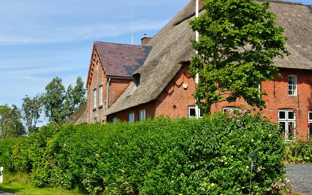 Le long de la petite route de campagne dans le village de Warmhoern de la commune de Tetenbuell, on trouve de nombreuses anciennes fermes de Frise du Nord appelées "Haubarg". Eiderstedt, Frise du Nord, Schleswig-Holstein, Allemagne. Été 2019.