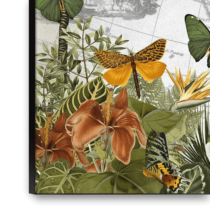Collage d'illustrations historiques de plantes et de papillons tropicaux dans un style vintage.