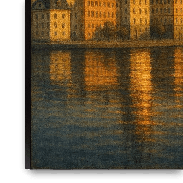 Achetez cette œuvre d'art de paysage L'île de Stockholm resplendit : Reflet d'une église historique au crépuscule par Travel Shop sur toile, aluminium, ArtFrame ou photographie (encadrée), impression d'art en haute qualité et tout format.