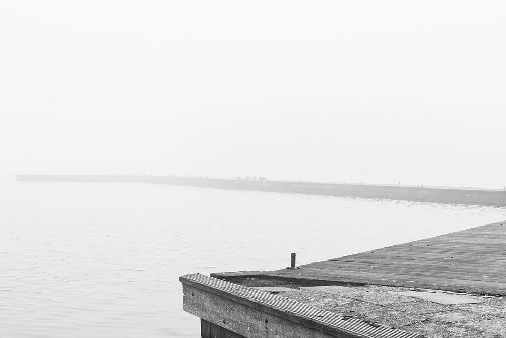 Un matin brumeux sur le Binnenmaas, situé dans la commune de Hoeksche Waard. Au loin, de l'autre côté de la route, se trouve une rangée d'arbres et une foulque nage sur l'eau.