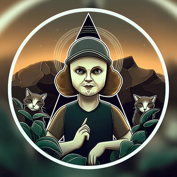 Entourée d'un cercle parfait et ancrée par un sceau triangulaire ascendant, cette figure se tient au seuil de la connaissance cachée. Deux gardiens félins émergent du feuillage et incarnent l'intuition et la protection, tandis que le geste calme de l'initié signale la conscience plutôt que l'ordre. Les montagnes et les anneaux…